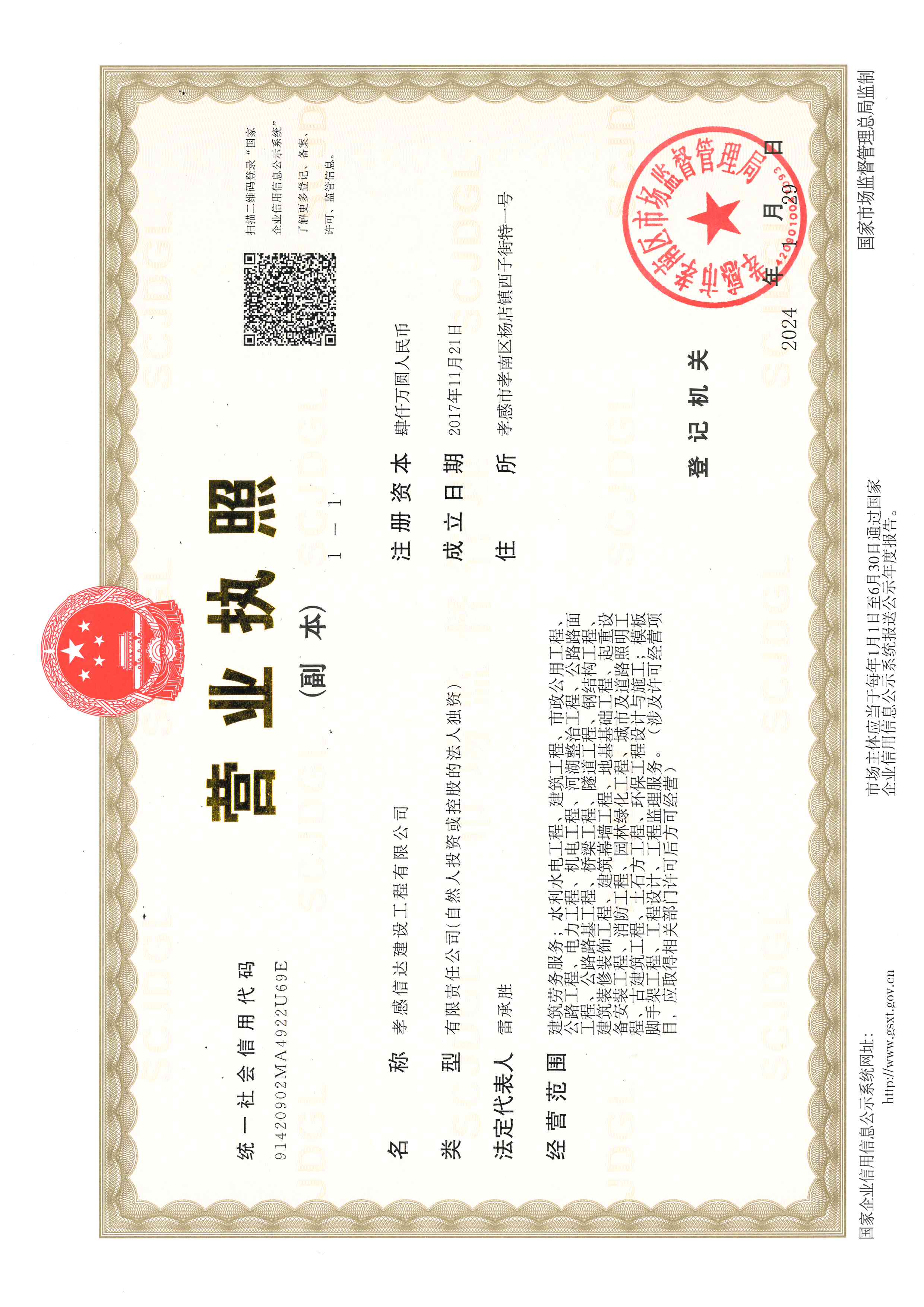 孝感信達(dá)建設(shè)工程有限公司成立于2017年11月21日,地址:孝感市孝南區(qū)楊店鎮(zhèn)西子街特一號(hào),注冊(cè)資金4000萬(wàn)元,有限責(zé)任公司(自然人投資或控股)。